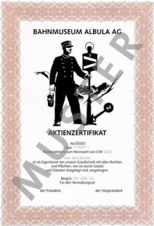Sie können eine Aktie der Bahnmuseum Albula AG für CHF 100.- (Nennwert CHF 1.-, Agio CHF 99.-) erwerben und werden dadurch jährlich an die Generalversammlung der Bahnmuseum Albula AG eingeladen